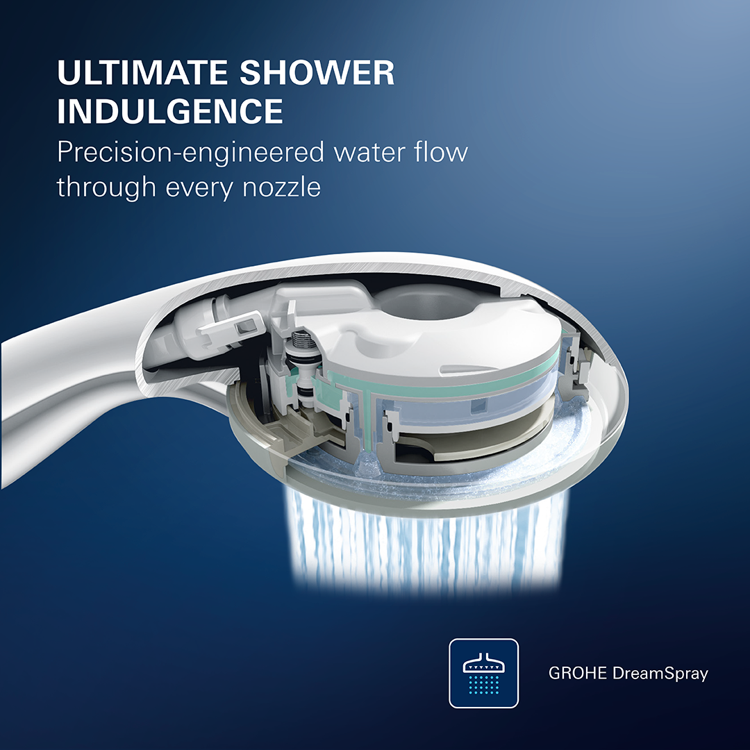 GROHE DreamSpray夢幻花灑技術確保每個噴嘴都能精準噴出適量的水,從頭到尾打造完美平衡的噴淋模式和始終如一的水壓。