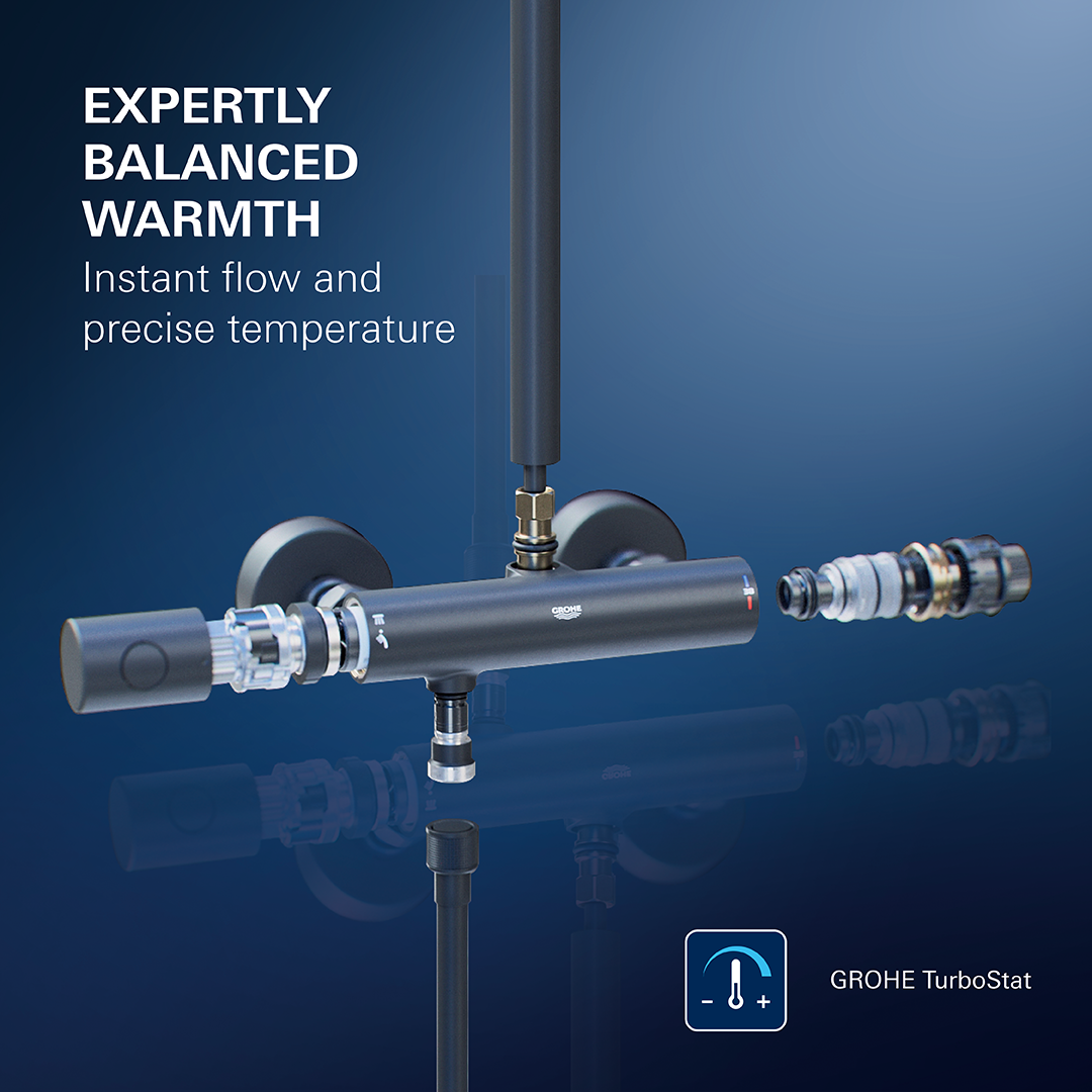 GROHE TurboStat精確恆溫技術採用精密設計的恆溫元件,可在短短0.3秒內對水壓變化做出即時反應,鎖定使用者設定的溫度,