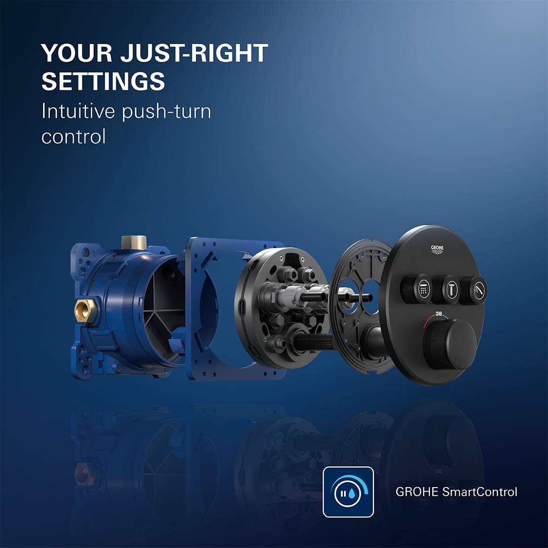 GROHE SmartControl智慧淋浴系統採用直覺的按壓旋轉式介面和內建記憶功能,能精準記住使用者的淋浴設定偏好。