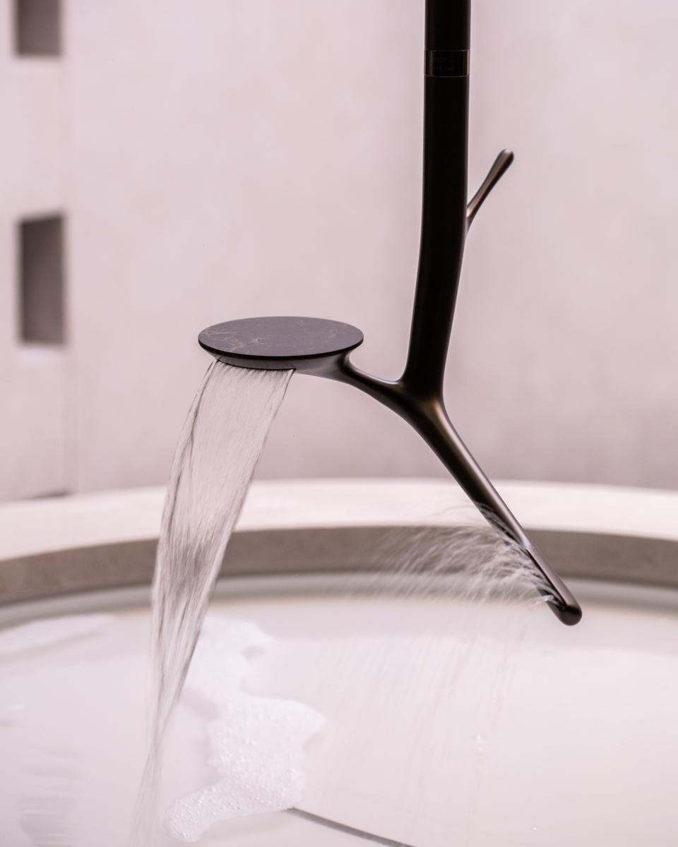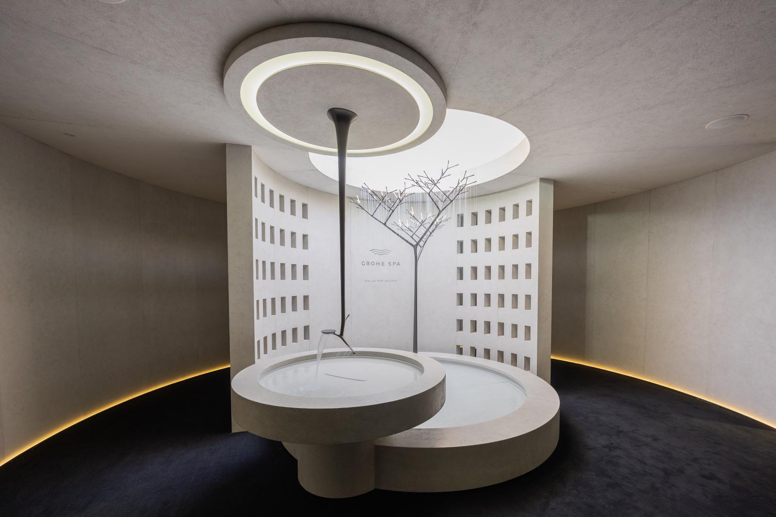 空間核心為GROHE SPA AquaTree,其流動有機的造型顛覆傳統淋浴想像,結合「親生命設計(Biophilic)」與3D金屬列印技術,使產品宛如自然「生長」而成,